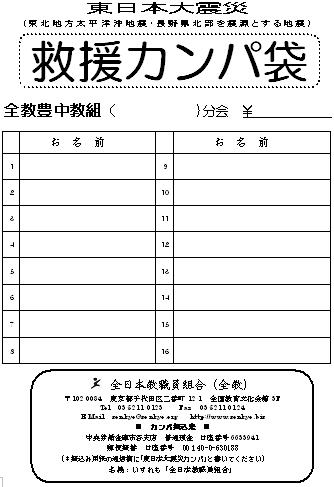 3月11日に発生した東北地方太平洋沖地震及び長野県北部を震源とする地震は、多数の死傷者、家屋の倒壊・流出など甚大な被害をもたらしています。こうした中、多くの方が避難生活を余儀なくされ、被災家庭の子どもたちの学習と生活をめぐる状況も大きな困難を抱えていることが予想されます。学校の施設等にも被害が及び、すでに臨時休校や高校入試日程の延期など教育活動に支障をきたしています。 豊中の教職員は、16年前、阪神淡路大震災の被災地域の教職員として、支援の活動の取り組んだ経験があります。学校関係の状況を確認するなどした後、必要とされる救援・支援を行うところですが、現在、交通手段の確保等もままならず、現段階では現地調査ができる状況にないとの全教報告もあり、当面の緊急支援として救援カンパを訴えるものです。寄せられたカンパの使途については、全教本部が各地の教育委員会や学校など現地の要請と状況に対応して検討します。 ※ カンパ袋を職場に届けています。ご協力願いします。 |